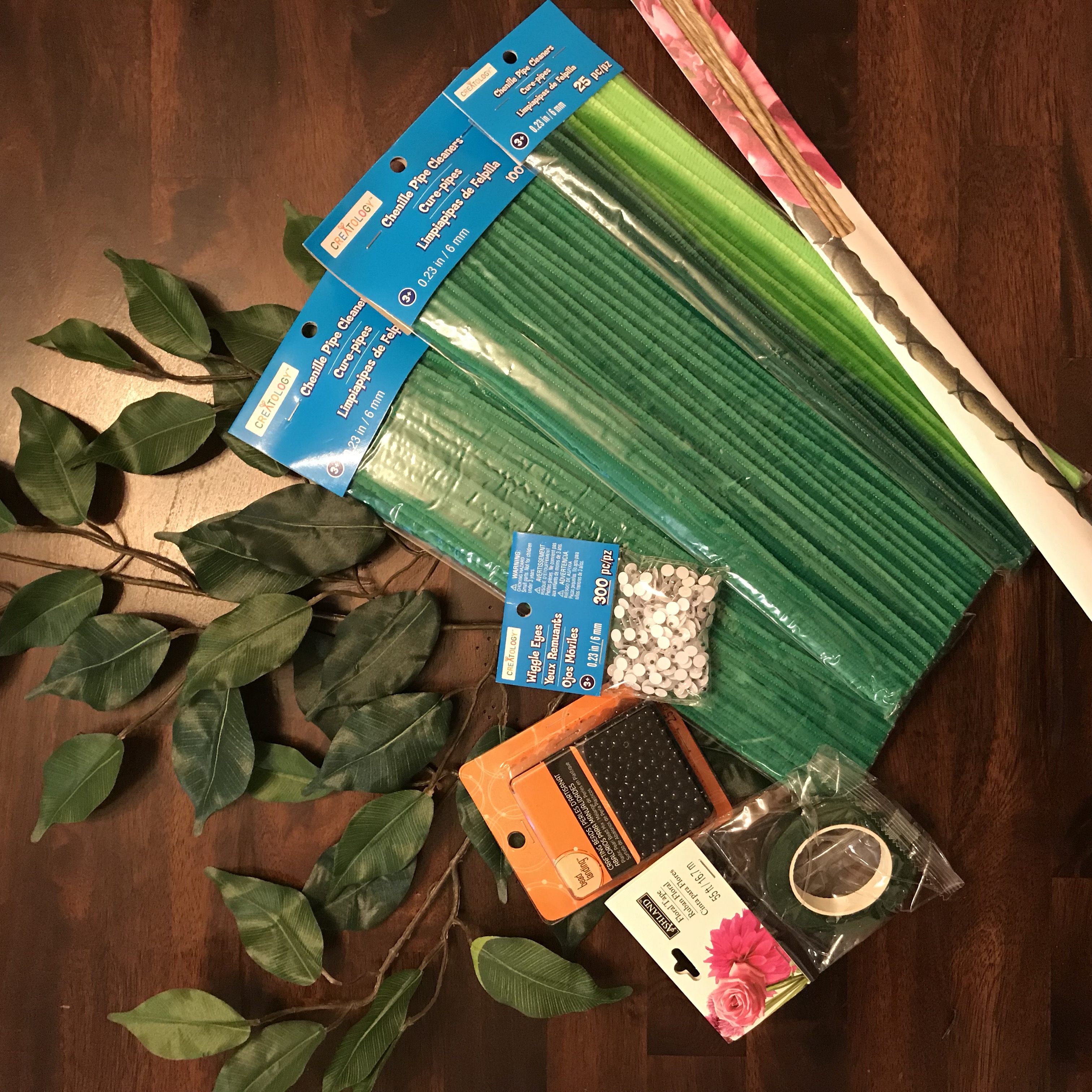 I got some floral wiring, pipe cleaner, floral tape, fake leaves, and some beads.