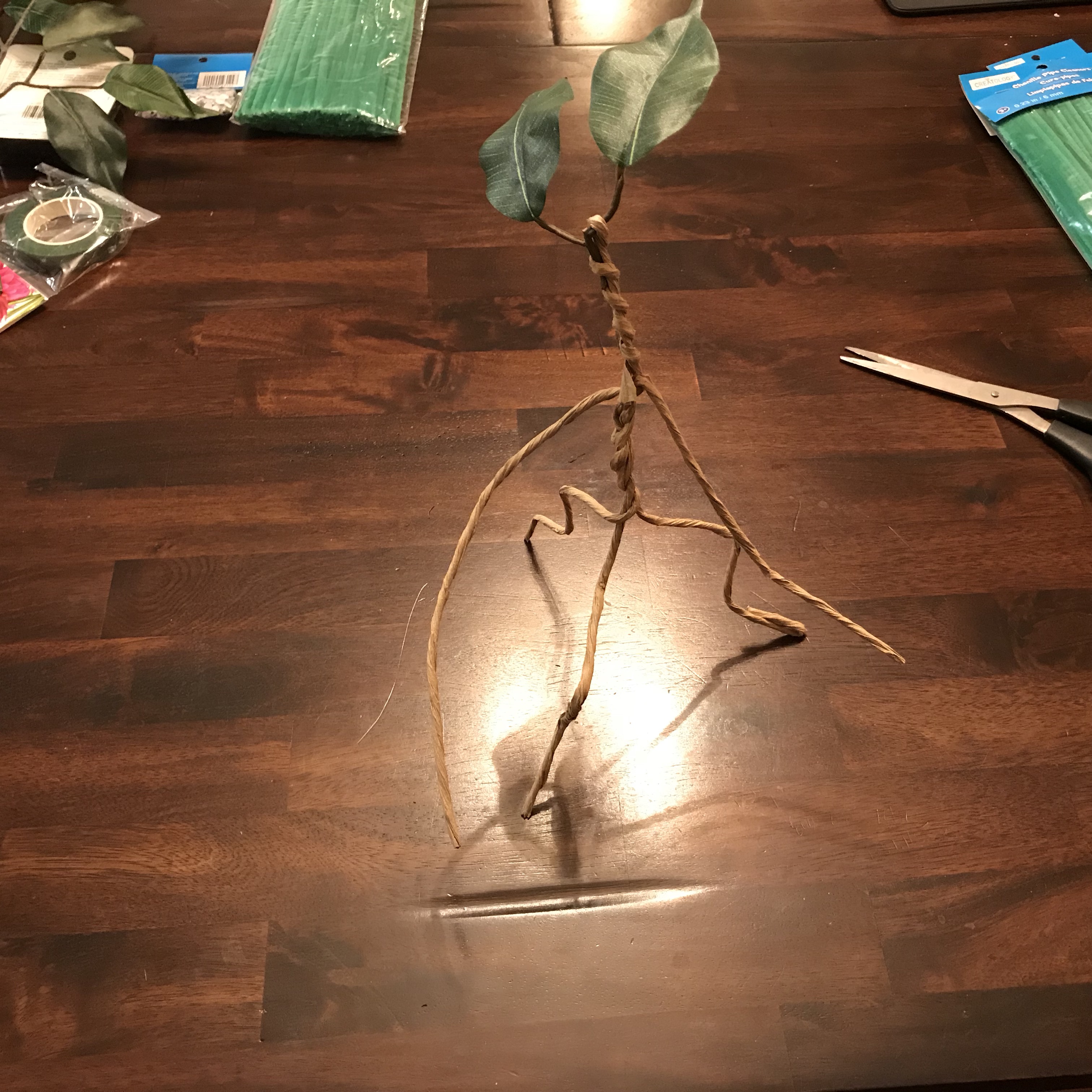 After that, I used floral tape to cover the entire thing. If you’ve never worked with floral tape, in order for it to stick, you have to stretch it out – then it will stick to itself. I found it easier to cut out foot long strips. Just make sure that at the end of the strips stretch and tear the end so that it is nice and sticky so it won’t unwind.