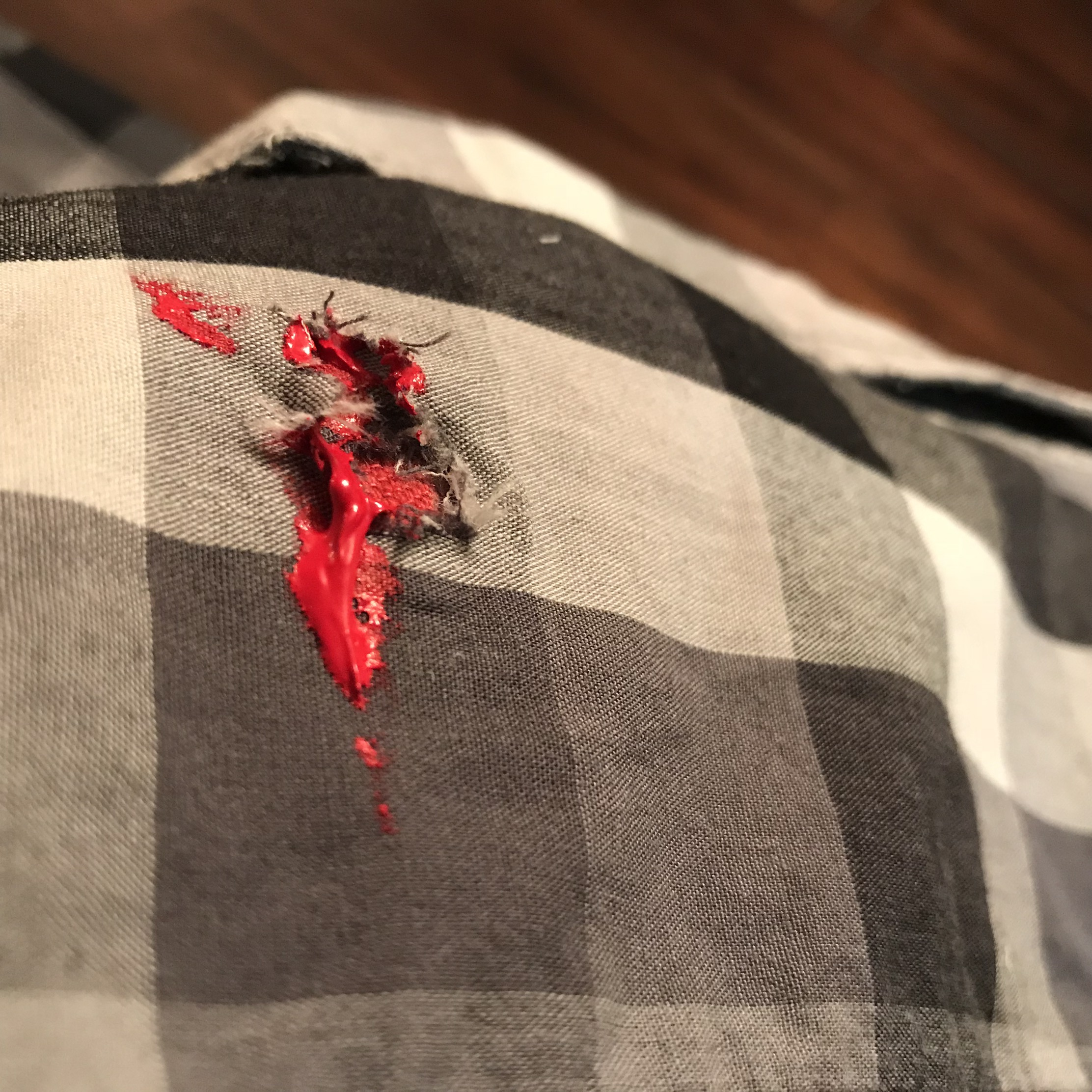 For the Zombie, I bought a cheap shirt from Walmart and “Zombified” it by cutting some holes, and then patching the holes with red fabric.