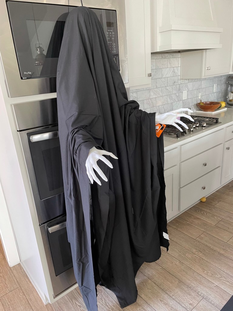Not pictured: a closeup of the finished dementor. I added torn strips of black cloth and then covered it with black cheese cloth. I glued the neck tight so that the head had more shape so they looked like the do in the movies. Trust me – they turned out great!